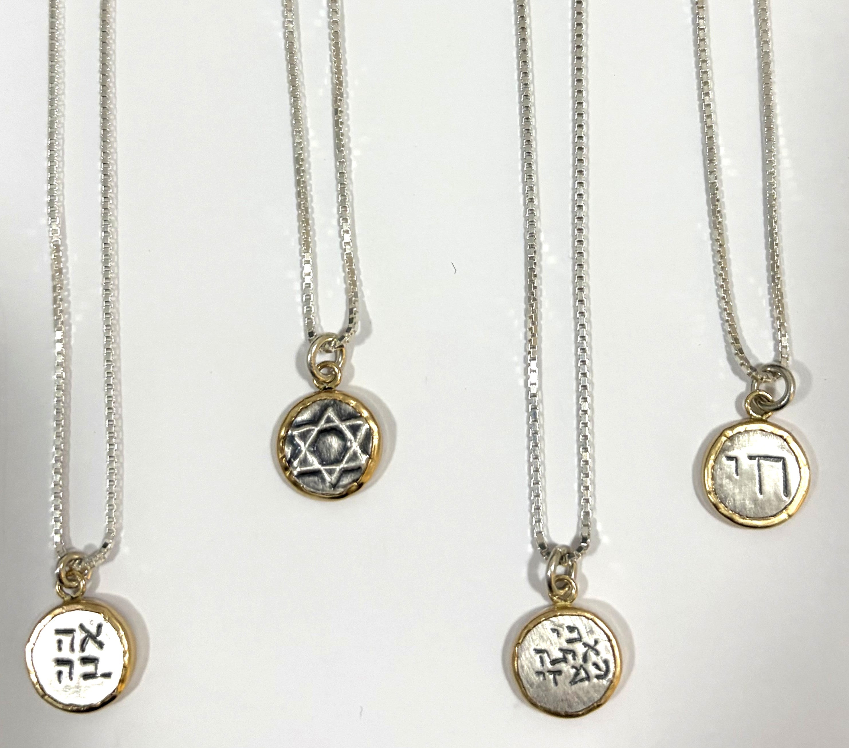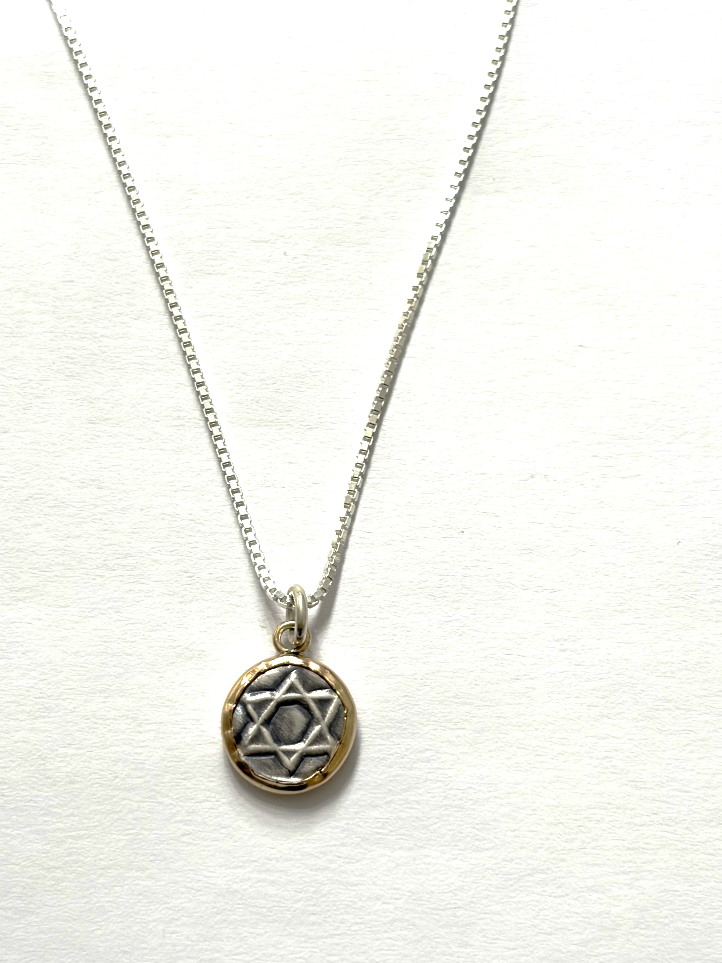 Celebrate faith, heritage, and timeless beauty with this stunning handcrafted Star of David pendant. This dainty round necklace features a hand-etched Magen David design in sterling silver, beautifully framed in gold-filled detailing for a sophisticated two-tone effect.