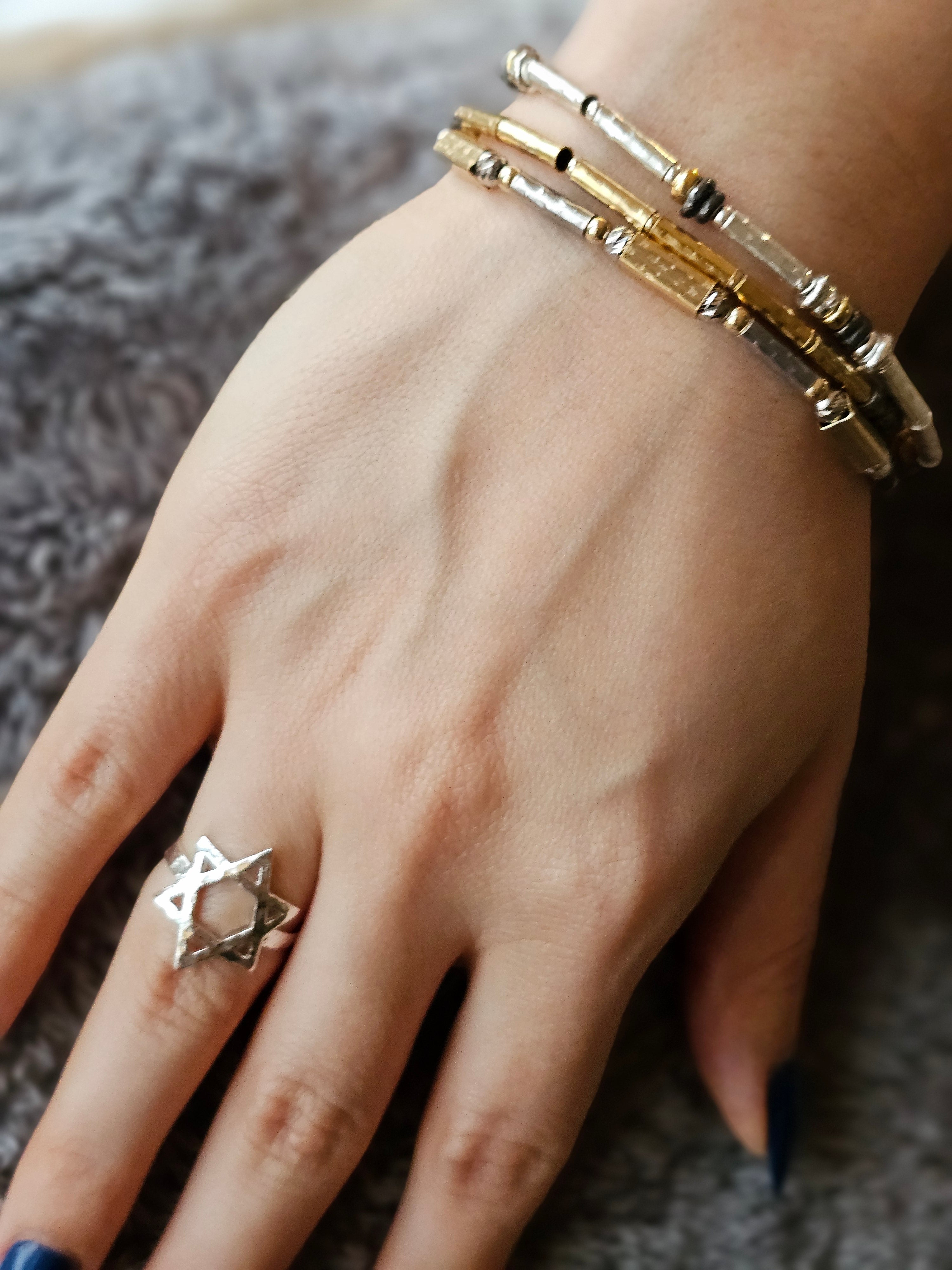 Susan I ordered this Star of David ring and hoped it was as pretty as it seemed in the picture. It’s exactly as show if not more beautiful. It fits perfectly and I love the look. It’s bold and beautiful and I wear it with great pride. So many compliments and can’t wait to shop for more items for gifts. Thank you Salena. Great customer service too which I appreciate so very much.