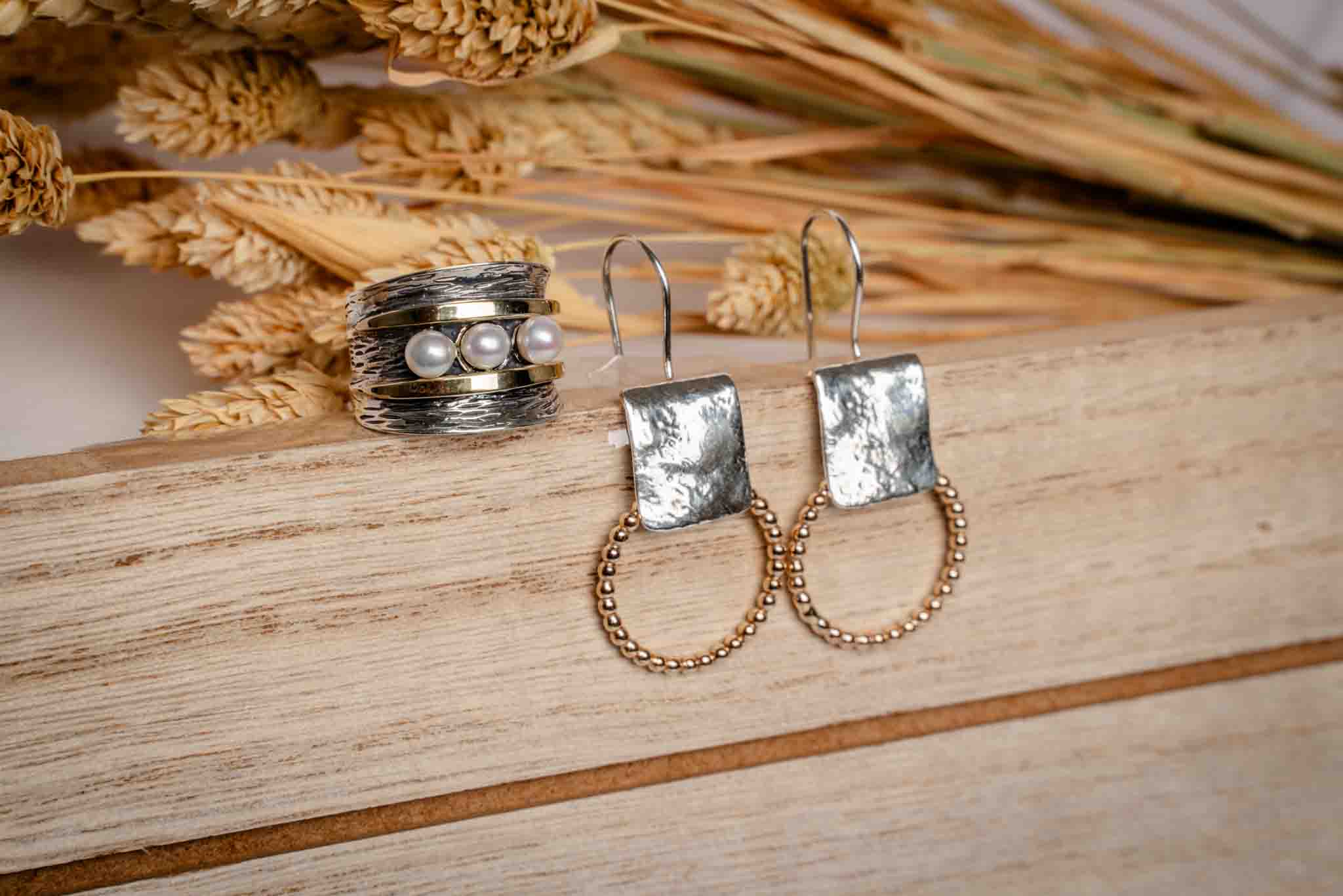 This exquisite textured sterling silver ring, handcrafted in Israel, is a perfect blend of modern sophistication and classic elegance. The ring features three lustrous white freshwater pearls set in the center, adding a touch of natural beauty and subtle shine. The combination of textured sterling silver, warm gold accents, and the elegance of the pearls creates a stunning design that is both contemporary and timeless.